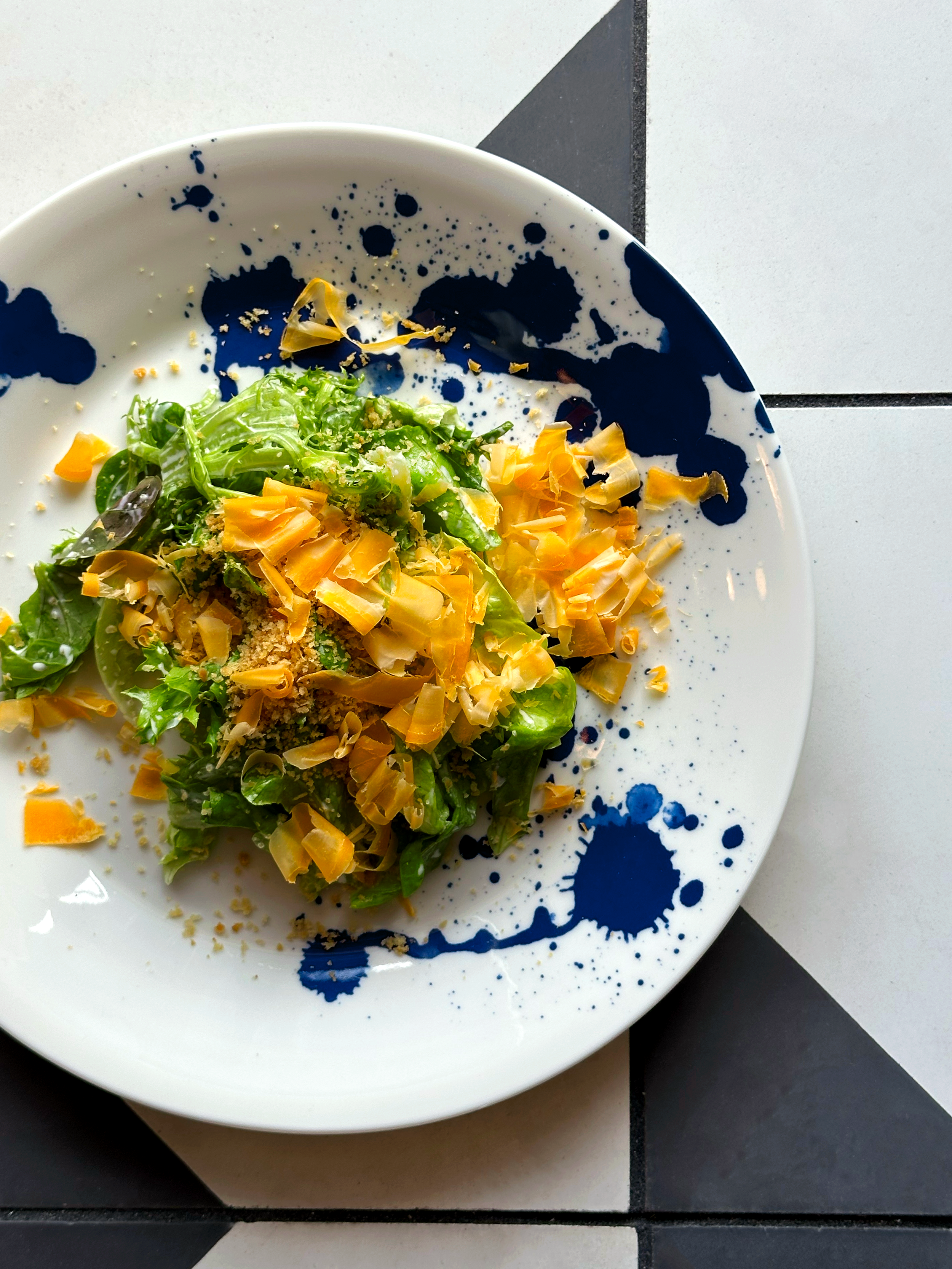 This anchovy-mustard accoutrement quickly evolved into a Caesar-ish salad dressing. We swapped cumbersome, crunchy croutons for Normandy butter-toasted breadcrumbs. We kept the romaine and ditched the parmesan cheese. Instead, we opted for a Normandy-bred delight, Mimolette, a bright orange-hued, earthy, and salty cheese that demanded to be shaved.